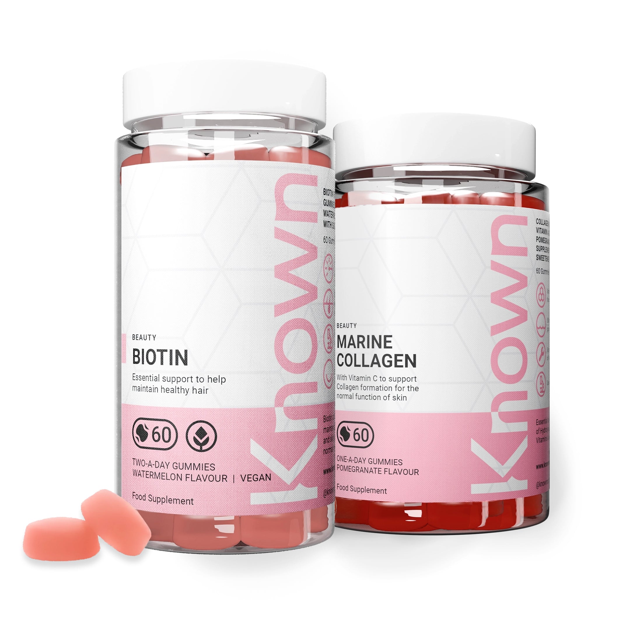 Biotin Gummies contribute to the maintenance of normal hair and skin. Marine Collagen Gummies provide collagen alongside Vitamin C, which contributes to normal collagen formation for the normal function of skin, and Vitamin A to help maintain normal skin.